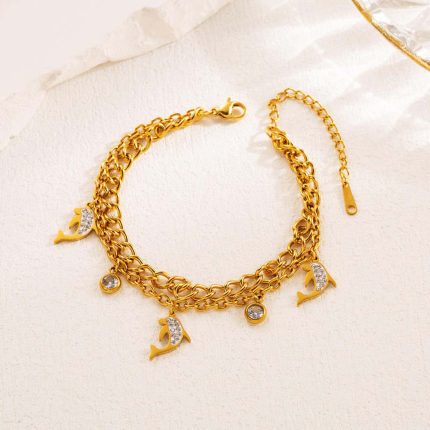 Stainless Steel New Fashion Fine Jewelry 4 Styles 2-Layer Zircon Butterfly Leafs Dolphin Charm Chain Bracelets For Women