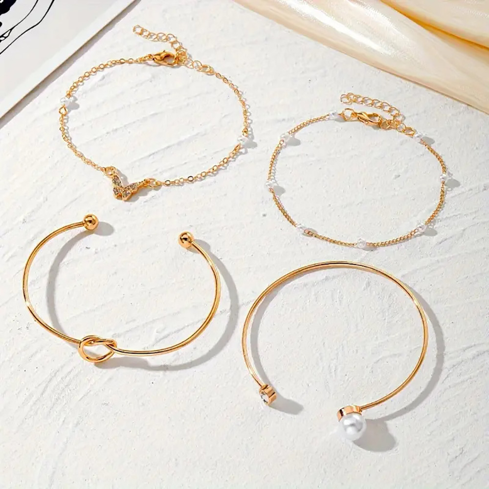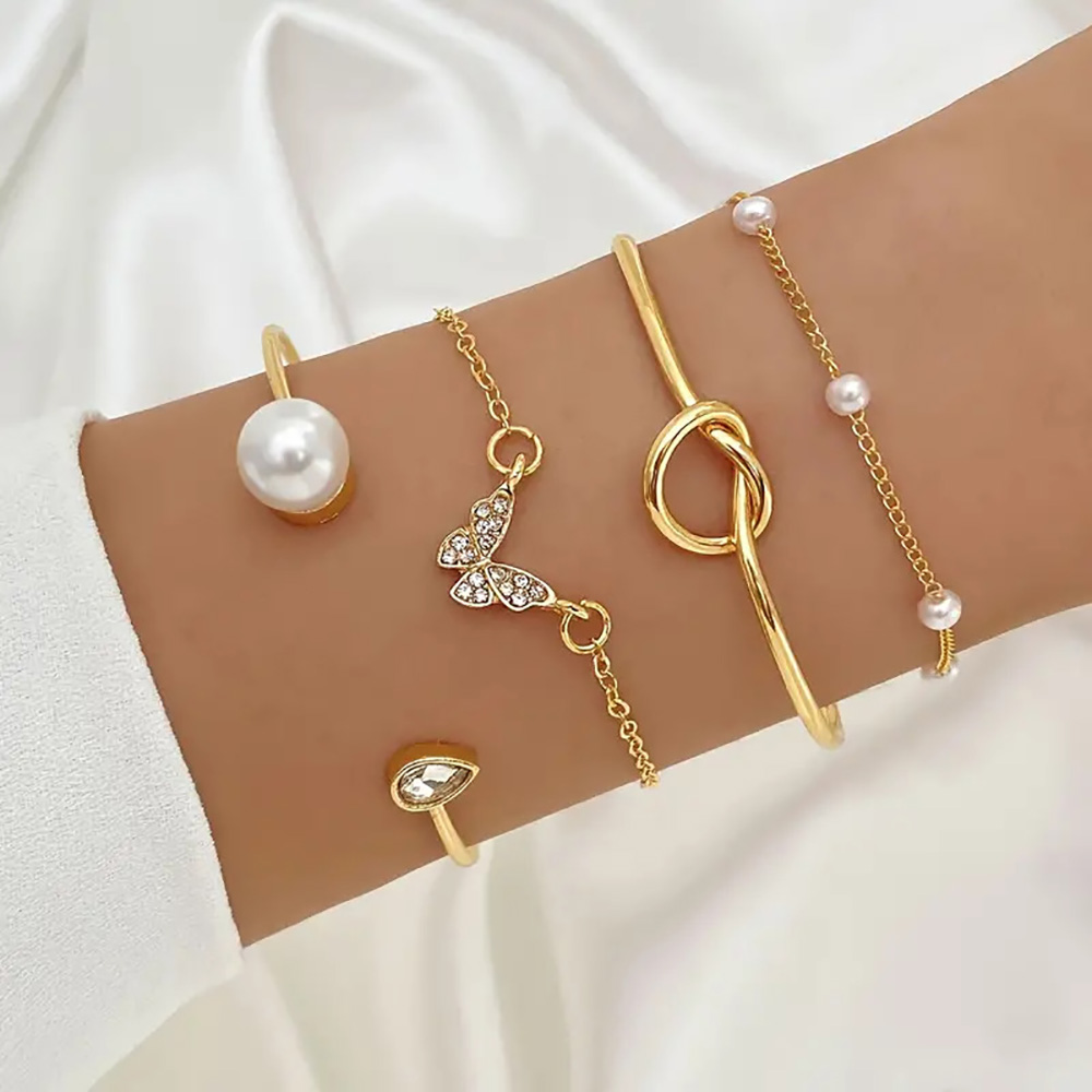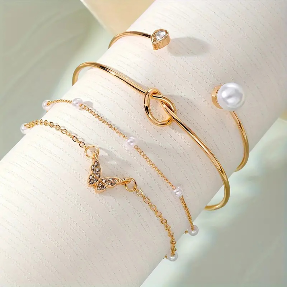 New 4pcs/set Bracelet Fashionable Creative Butterfly Design Bracelet & Faux Pearl Bracelet Set With Rhinestone For Women & Girls