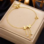butter-fly motifs and is resistant to tarnishing. Stainless steel is a durable and corrosion-resistant material commonly used in jewelry making. The anti-tarnish feature ensures that the bracelet maintains its shine and appearance over time without darkening or discoloration, which can be common in some other metals. The