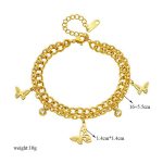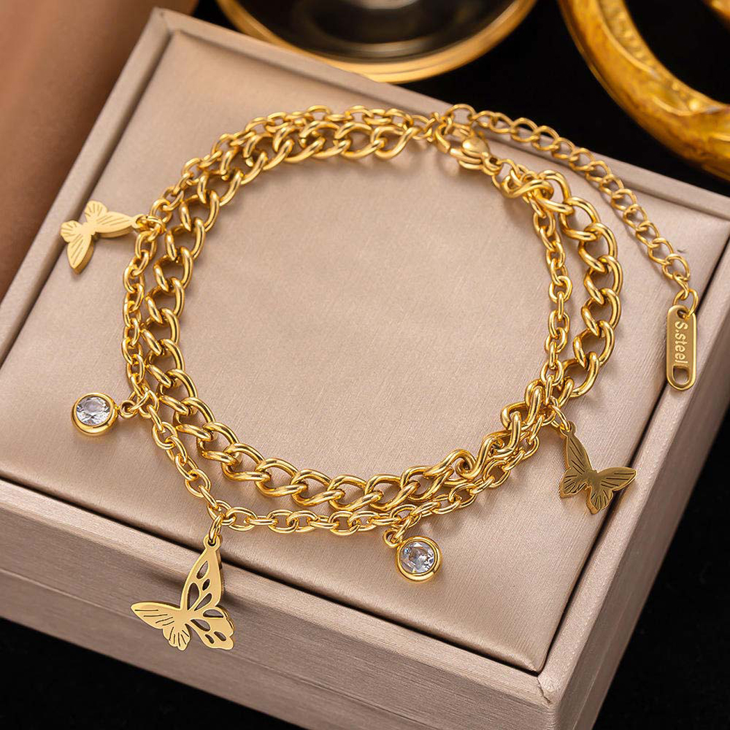 butter-fly motifs and is resistant to tarnishing. Stainless steel is a durable and corrosion-resistant material commonly used in jewelry making. The anti-tarnish feature ensures that the bracelet maintains its shine and appearance over time without darkening or discoloration, which can be common in some other metals. The