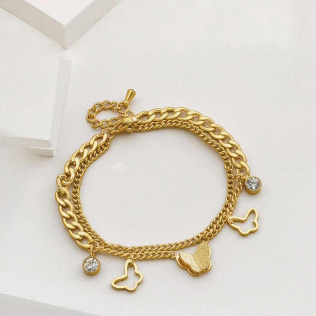 butter-fly motifs and is resistant to tarnishing. Stainless steel is a durable and corrosion-resistant material commonly used in jewelry making. The anti-tarnish feature ensures that the bracelet maintains its shine and appearance over time without darkening or discoloration, which can be common in some other metals. The