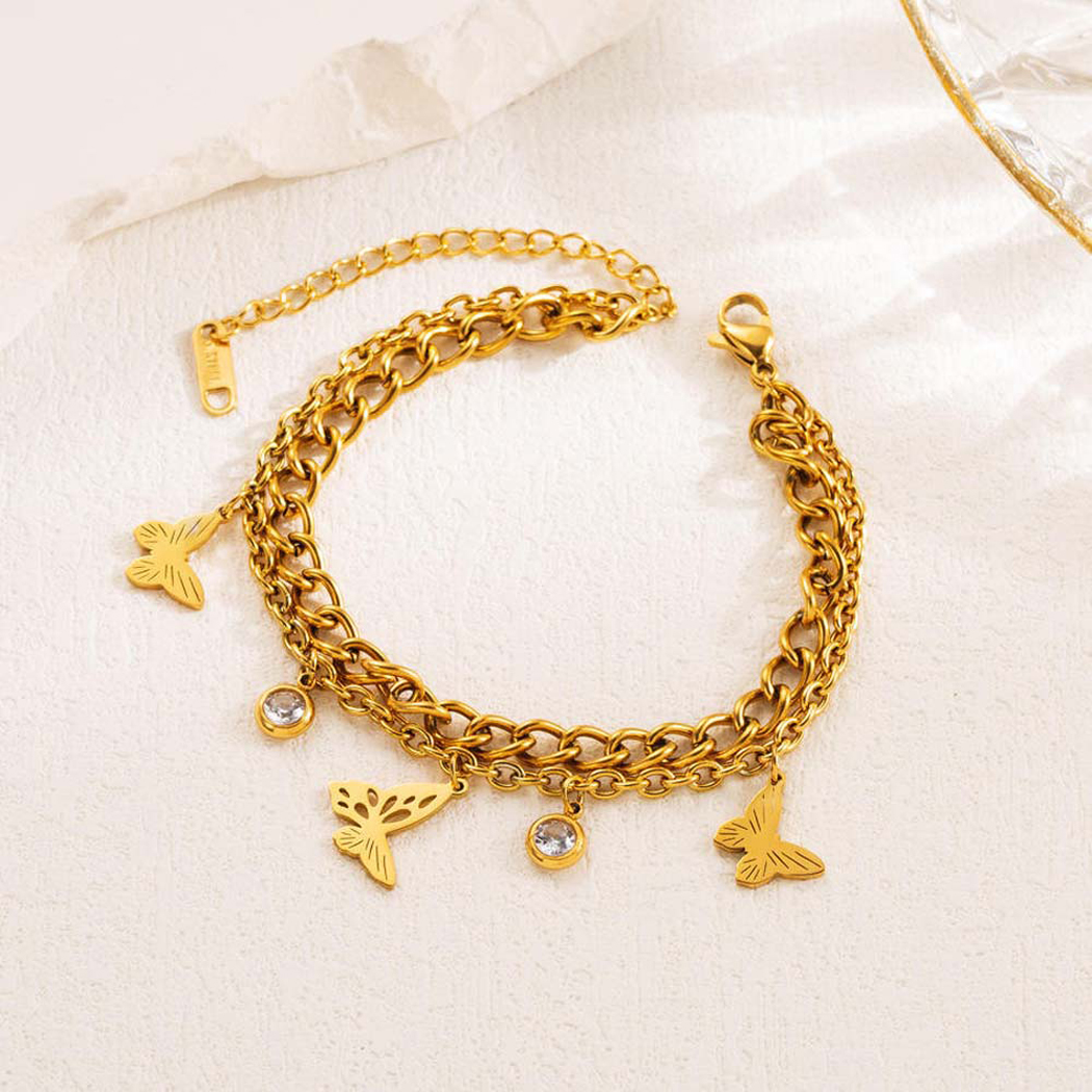 butter-fly motifs and is resistant to tarnishing. Stainless steel is a durable and corrosion-resistant material commonly used in jewelry making. The anti-tarnish feature ensures that the bracelet maintains its shine and appearance over time without darkening or discoloration, which can be common in some other metals. The