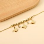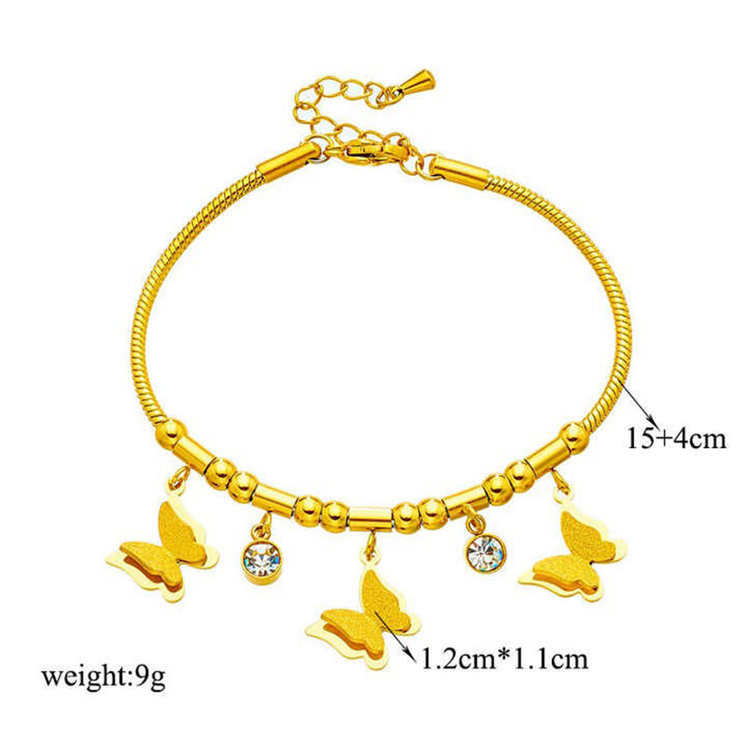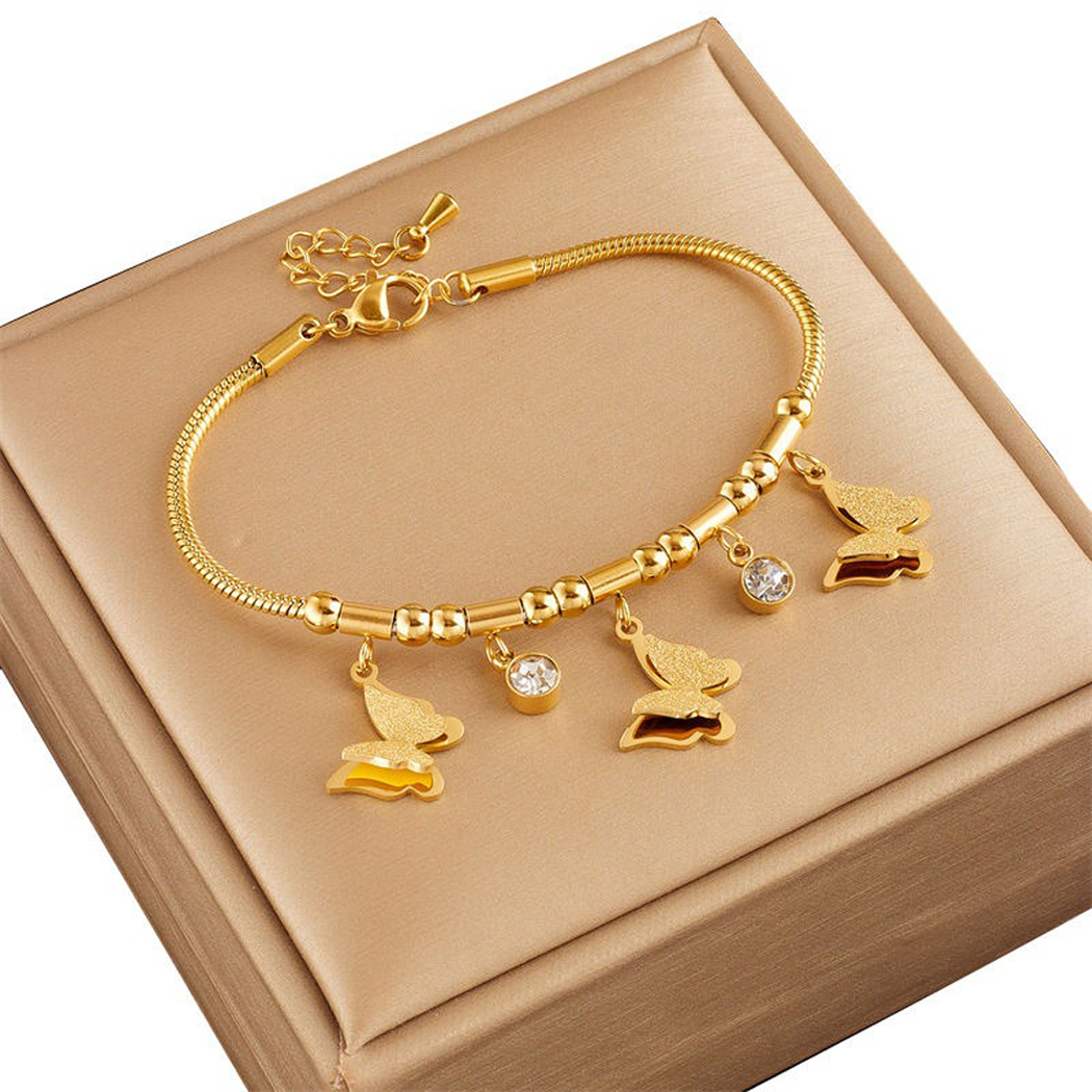 butter-fly motifs and is resistant to tarnishing. Stainless steel is a durable and corrosion-resistant material commonly used in jewelry making. The anti-tarnish feature ensures that the bracelet maintains its shine and appearance over time without darkening or discoloration, which can be common in some other metals. The